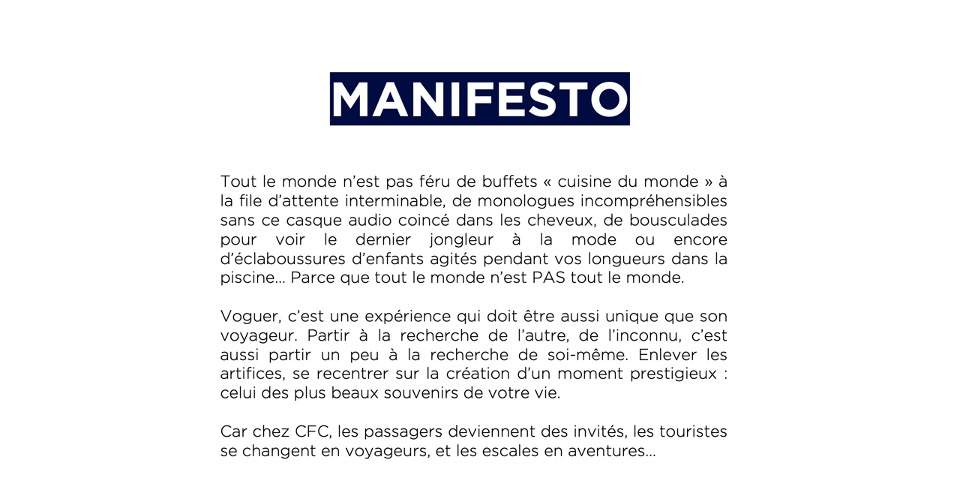 Campagne d'affichage pour un premier départ de croisière. CFC Croisière est une nouvelle compagnie française pensée pour une clientèle française. De la cuisine au personnel, tout est « comme à la maison ».