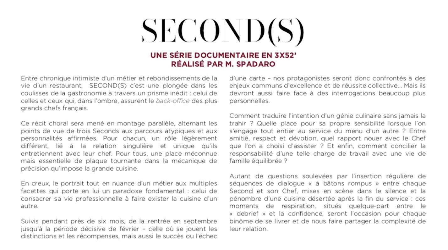 Au cours d’une première série documentaire, on se penche sur l’univers de la haute gastronomie à travers le duo formé par le Chef et son chef exécutif, familièrement appelé « Second ».